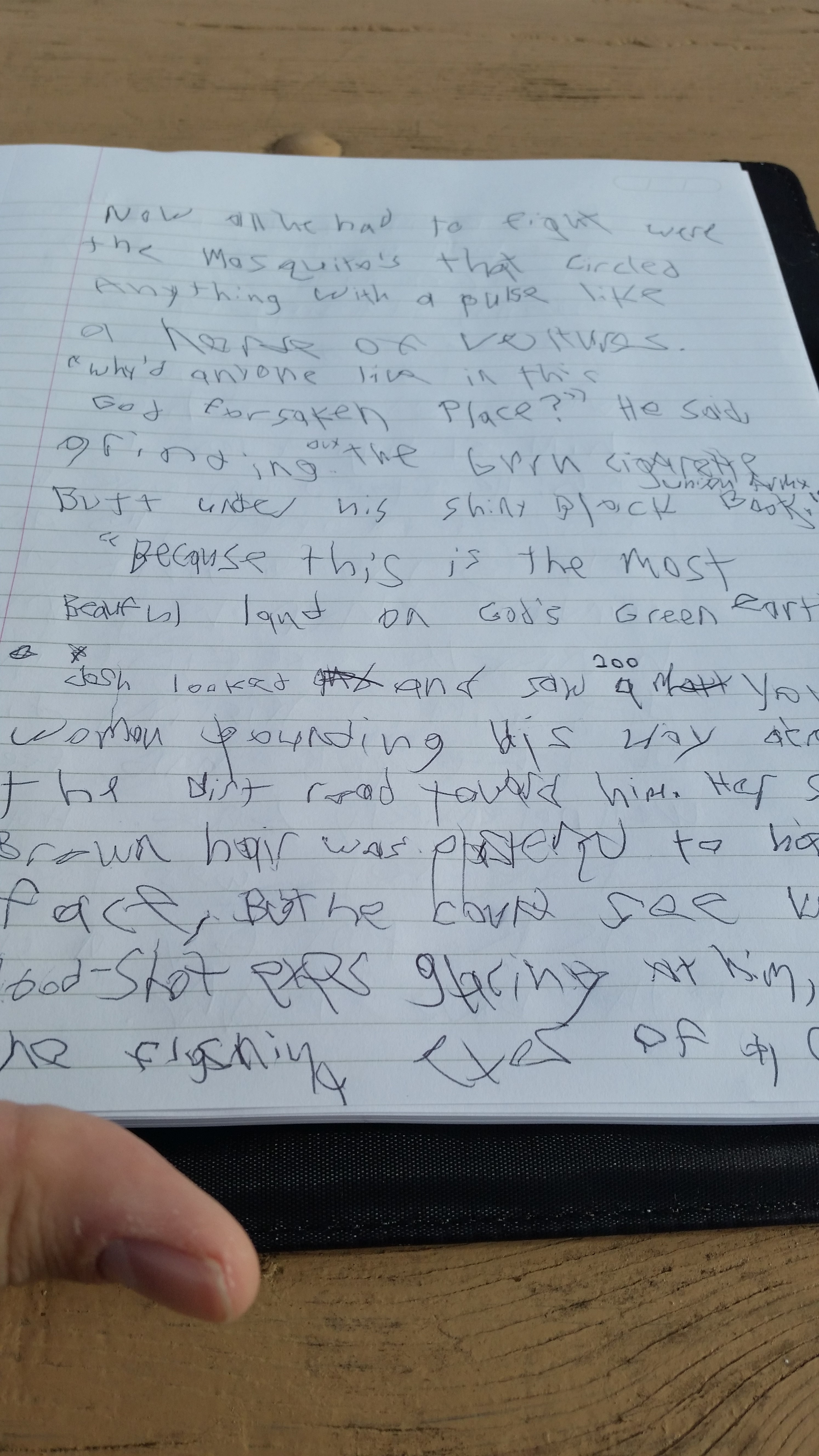 -Saw a young woman pounding her way across the dirt road towards him. Her shaggy brown hair was plastered to her face but he could see her blood-shot eyes glaring at him, like the flashing eyes of a cat hiding beneath a dark porch.