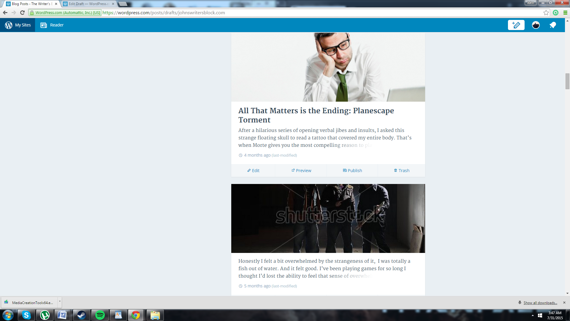 These are two articles (the bottom one is only partially written) about Planescape Torment, and somehow my brain convinced me that no one wanted to read those. Even though one of my amazingly generous patrons (from my Patreon page. which you should still contribute to despite my just admitting how terrible I am) actually requested articles on this very subject, my brain still figured that no one wanted to read any of that.